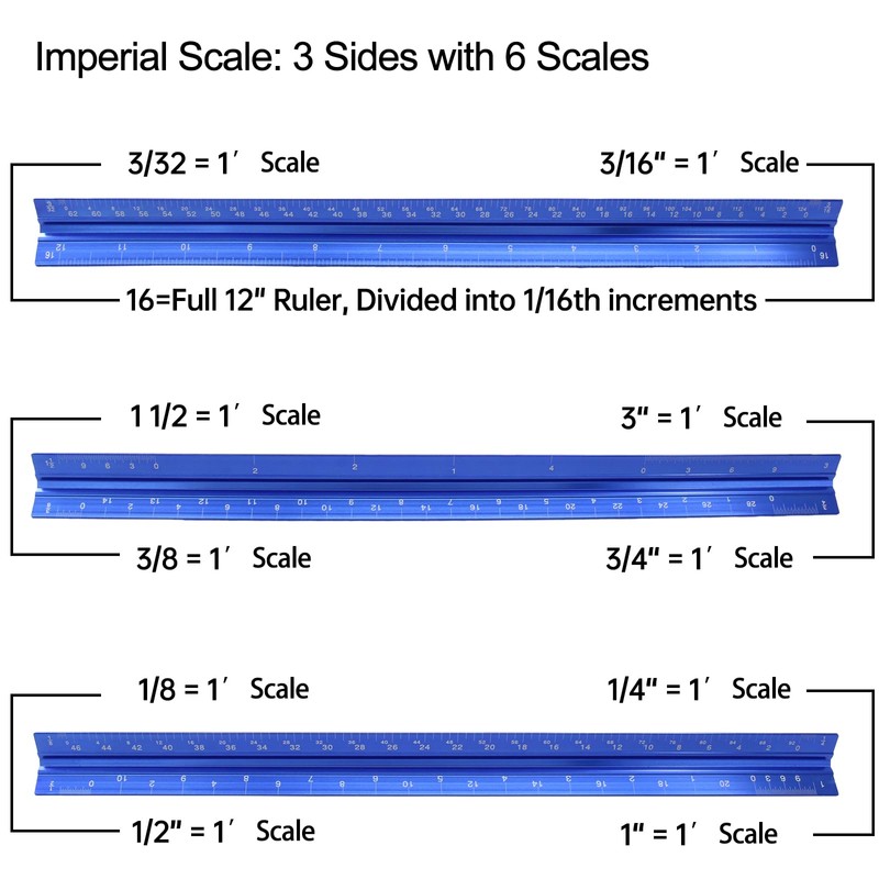 - Imperial Scale: 3 Sided Imperial Scales: 1-1/2", 1, 3/4", 3/8", 3/16", 3/32", 1/2", 1/4", 1/8", 3, 16. A variety of proportion to meet your needs.