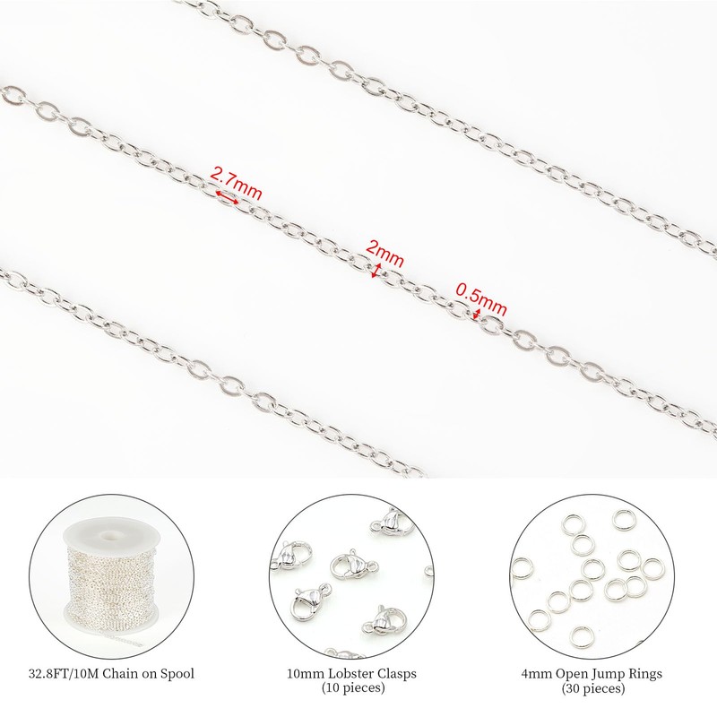 - 【Size and Quantity】 The jewelry making supplies kit include a roll of silver cable chain, 32.8 feet/10 meters long in total, the size of the cable link is 2.7mm long, 2mm wide and 0.5mm thick; 10 pieces of stainless steel lobster Clasps, 10mm in length; 30 pieces of stainless steel open jump rings, 4mm in diameter and 0.6mm thick.