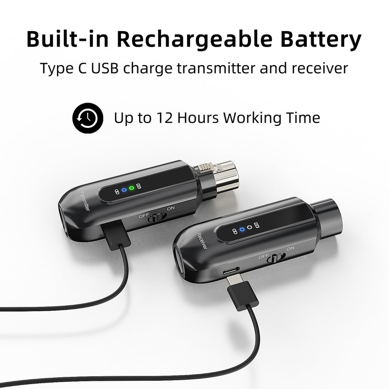 • 𝟏𝟐 𝐇𝐨𝐮𝐫𝐬 𝐁𝐚𝐭𝐭𝐞𝐫𝐲 𝐋𝐢𝐟𝐞 - The wireless system has a built-in high-capacity battery that provides up to 12 hours of continuous use after 2 hours charge. Transmission range of up to 150ft. in open areas and the locking design of the XLR plug prevents the transmitter from being accidentally dropped