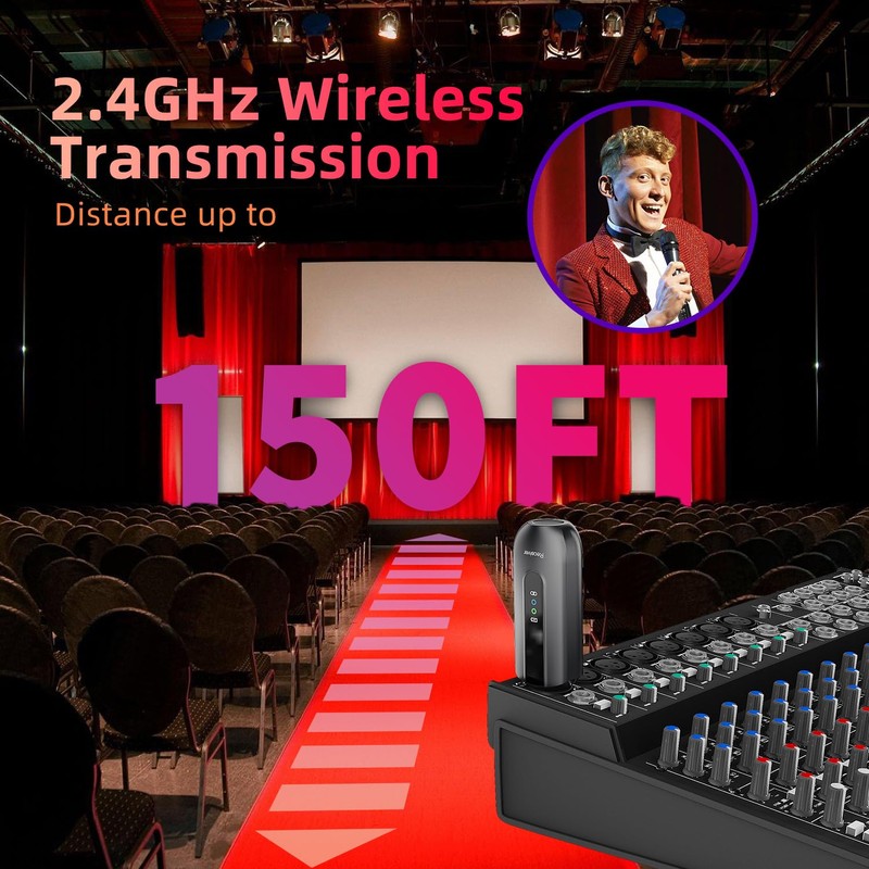 • 𝟒𝟖𝐕 𝐏𝐡𝐚𝐧𝐭𝐨𝐦 𝐏𝐨𝐰𝐞𝐫 - Turn off the 48V switch, this audio transmitter and receiver can be used to connect dynamic microphones. Turn on the 48V switch, it can be used to connect a condenser mic. The actual usage time differs due to the power consumption of the microphones of each brand. It is recommended that you test the actual available time before the official performance to avoid affecting your normal work