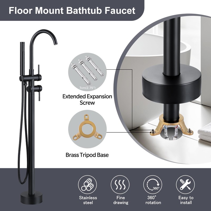 - 【What's Included】standing bathtub faucet body, brass faucet tube, handheld shower, cold and hot hose, base cover, mounting hardware and installation instruction.