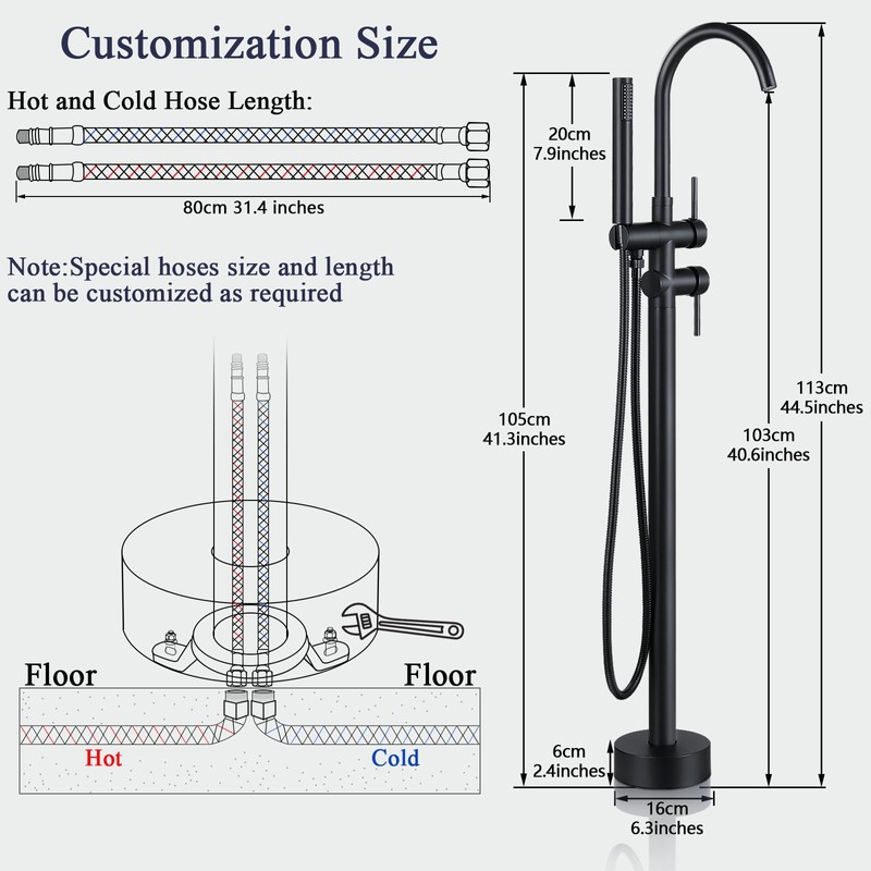 - 【Freestanding Faucet Dimension】:Overall Height: 44.5" / 117cm, Spout Height: 40.6"/ 106cm, Spout Reach: 7.08"/ 18cm.