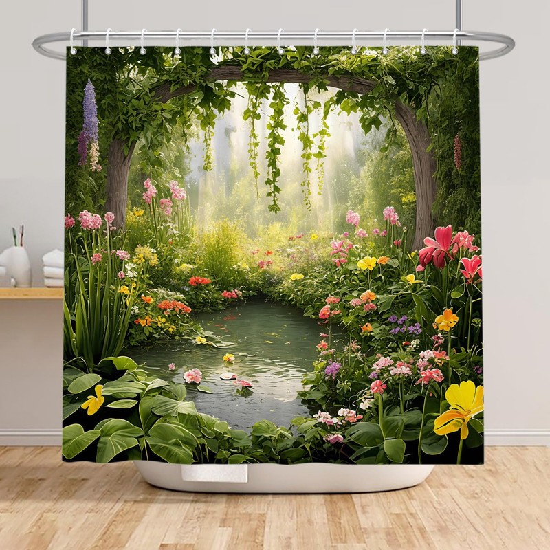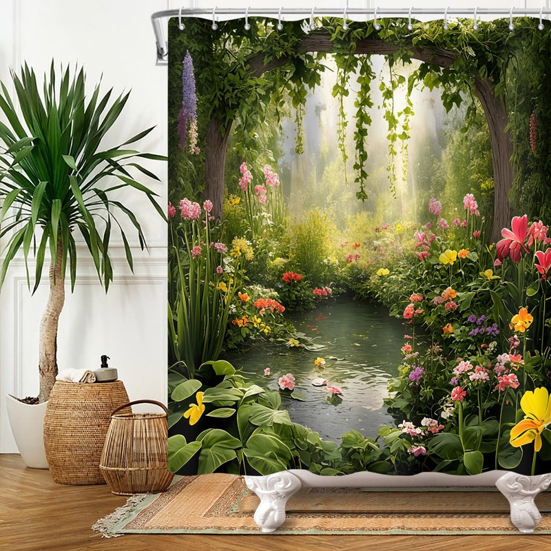 Kzzfqxb 165x180cm Shower Curtains with Plastic Hooks, Lush Green Wonder Flowers Forest Lotus in Pond Oil Painting Occluded for Bathtub, Refreshing Beautiful Garden Polyester Fabric for Bathroom