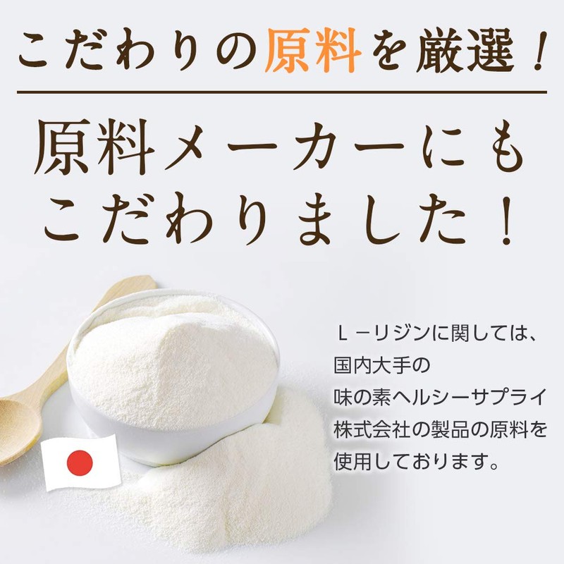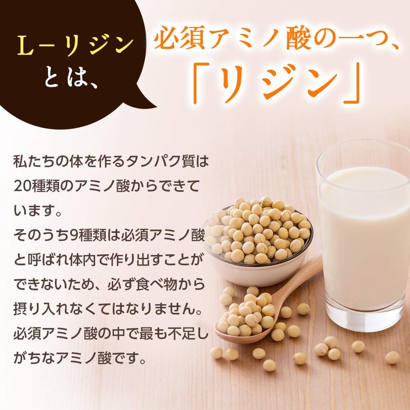 • 原材料名:L-リジン塩酸塩(国内製造)、セルロース、ステアリン酸カルシウム、微粒二酸化ケイ素、糊料(メチルセルロース)