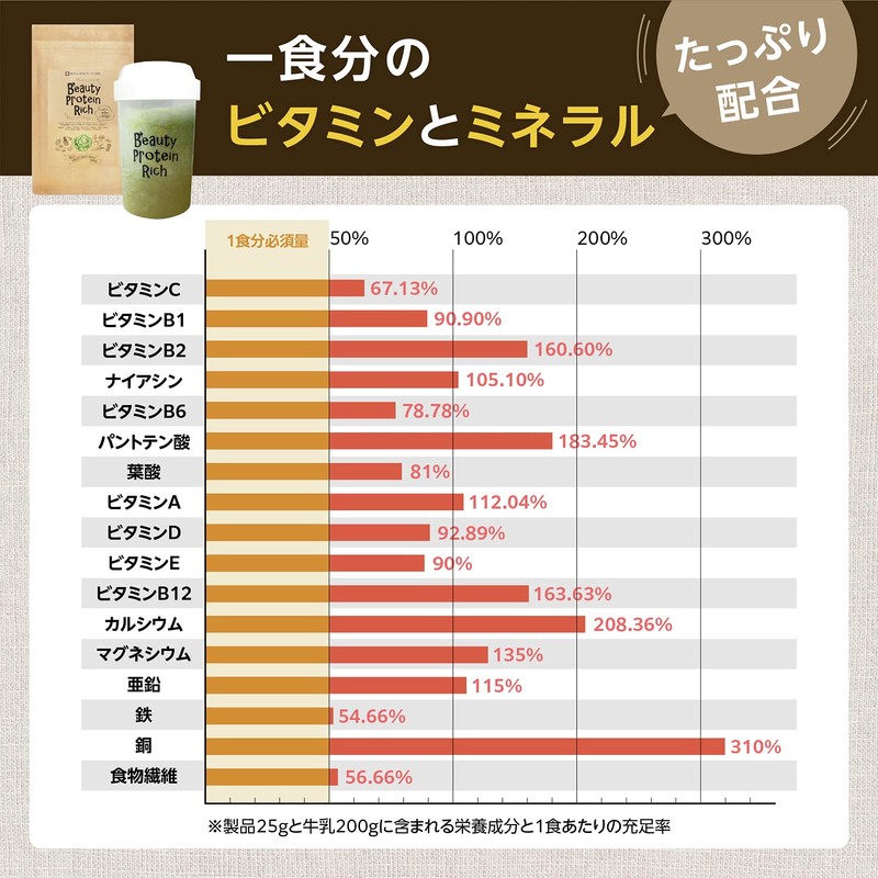 - ・お肌、髪、内臓、血液の原料のたんぱく質が不足するダイエット、美しい体を作るプロテインは必須なのです。たんぱく質は1食12グラムです。