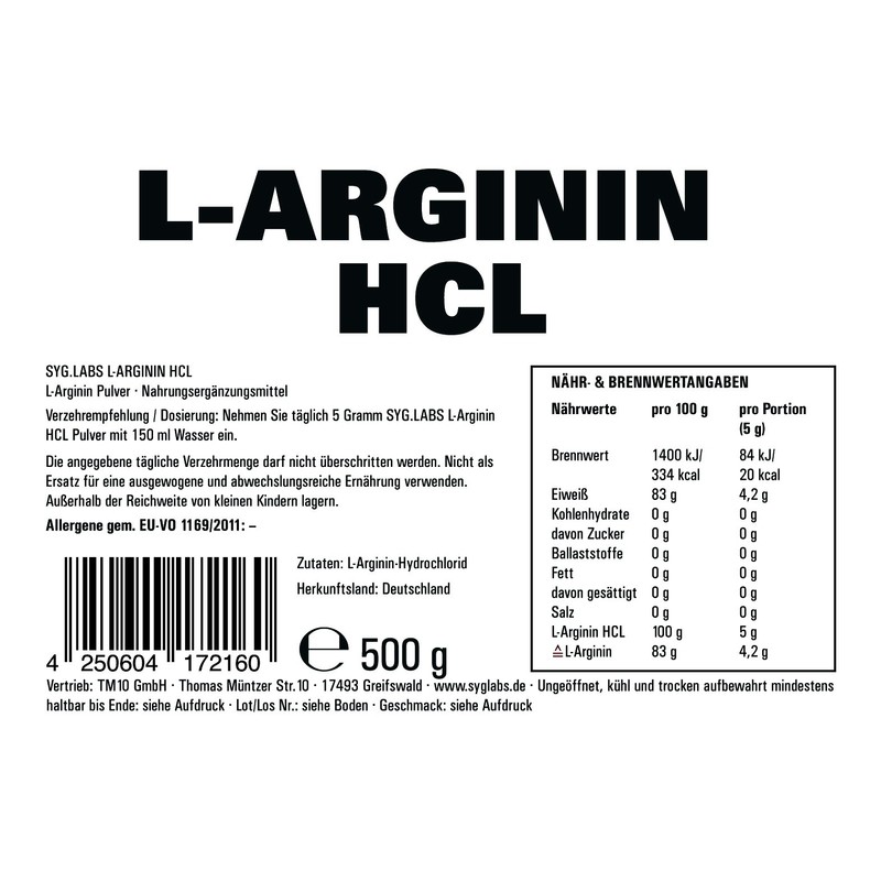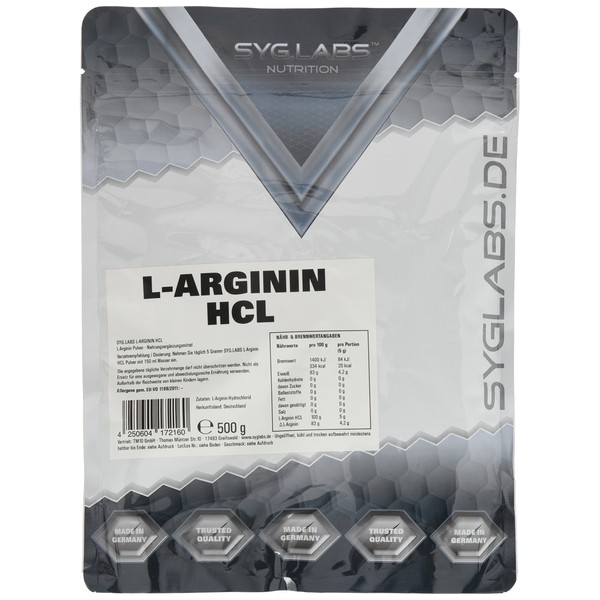 - Great value for money: 500 g bag L-arginine hydrochloride powder for approx. 100 servings of 5 g.