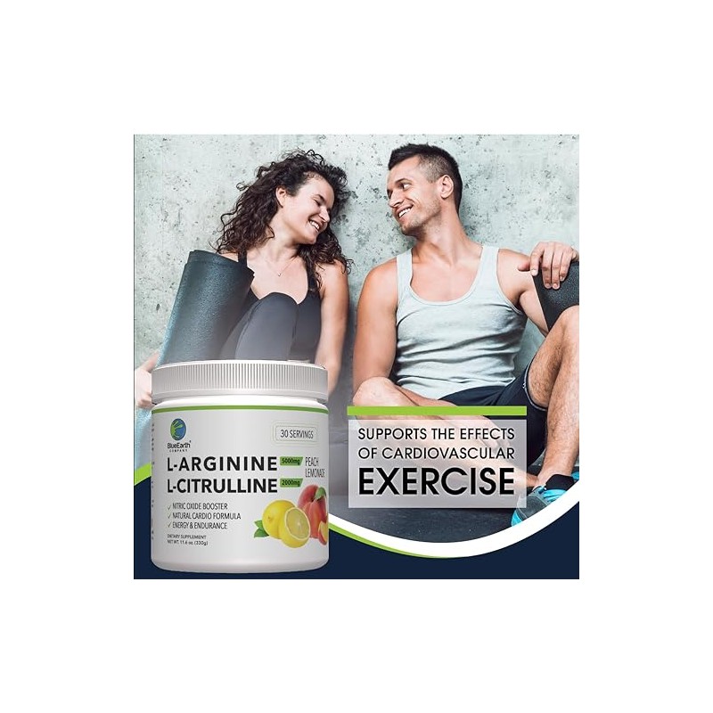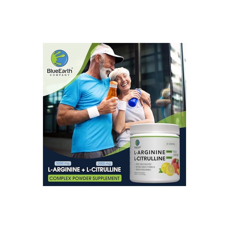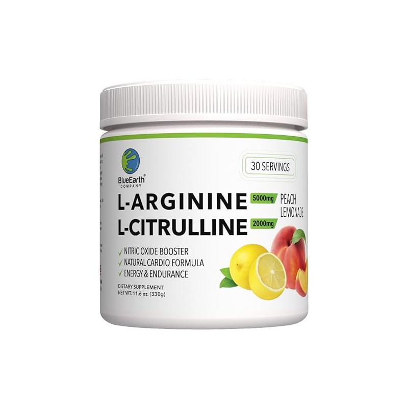 L-Arginina 5000 mg + L-Citrulina 2000 mg Complejo Suplemento en Polvo - Potenciador de óxido nítrico - Soporte de presión arterial - Sabor a limonada de melocotón - 330 g - BlueEarth Company..