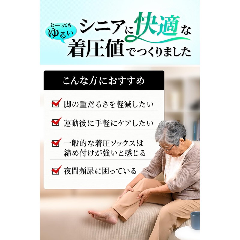 - 【50歳からの 着圧ソックス(コンプレッションソックス)】アクティブシニアの着圧ソックスはシニア専用の設計に仕上げた 着圧ソックス。「ラクラク歩行(ウォーク)」は高齢者の脚の悩みを医師と共に徹底研究。シニアの方以外に妊婦さんなど弱めの着圧をお求めの方にも大好評。