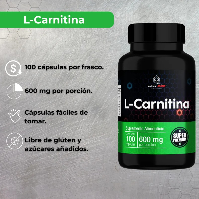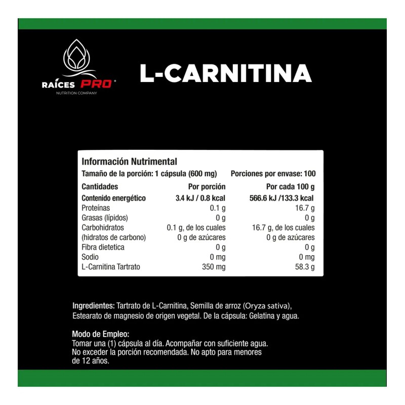 L Carnitina Super Premium 100 Cápsulas Raíces Pro Sabor Sin Sabor 3 Meses de Uso