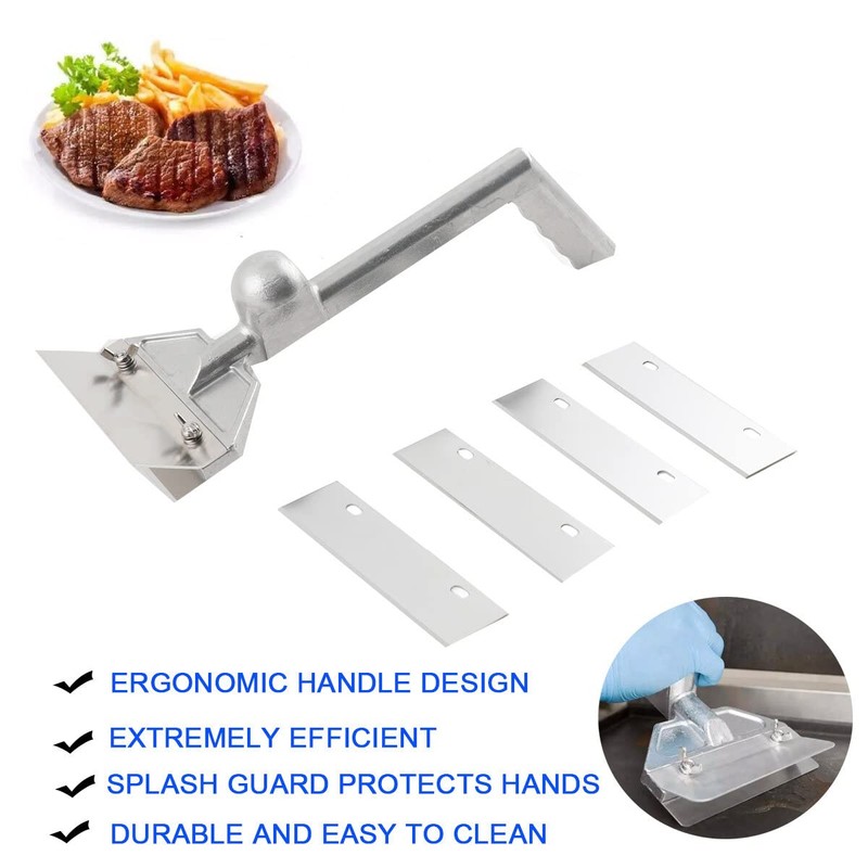 - 【Easily Removes Burnt Caked-On】: The ergonomic handle makes it really easy to use and saves your hands from getting all burnt from cleaning the grill. The knob on the handle helps apply the pressure needed to clean your griddle surface properly and the wide 6 blade makes the job go faster. Grease and residue does get between the blade and handle to prevents residue from splashing upward during cleaning.Making clean your griddle so easy !