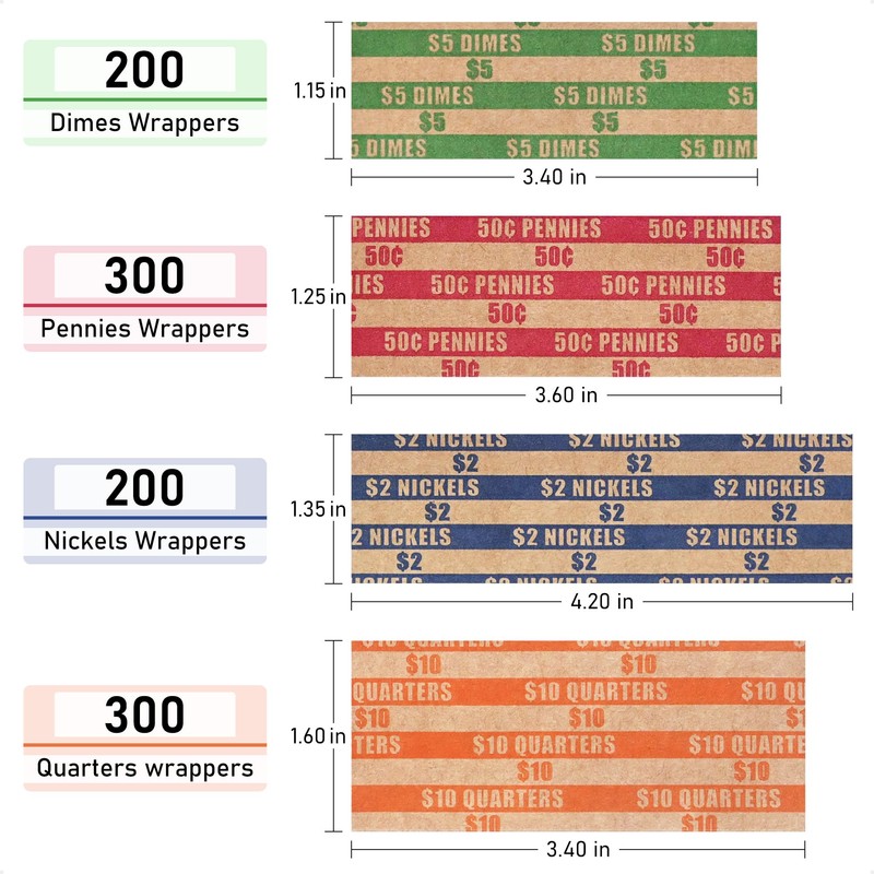 - 1000 pcs assorted flat coin wrappers, Including 300 pennies, 200 nickels, 200 dimes and 300 quarters
