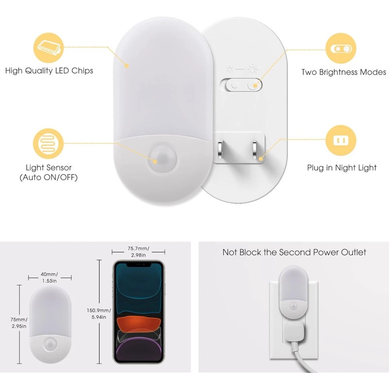 - Automatic On/Off: With smart dusk to dawn sensor inside, LOHAS night lights plug into wall can accurately sense the surrounding brightness, turning on when ambient brightness is low automatically. The stylish and sophisticated outlook of automatic night light is space-saving and does not block the bottom outlet for other devices.