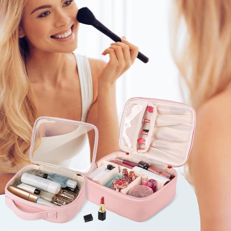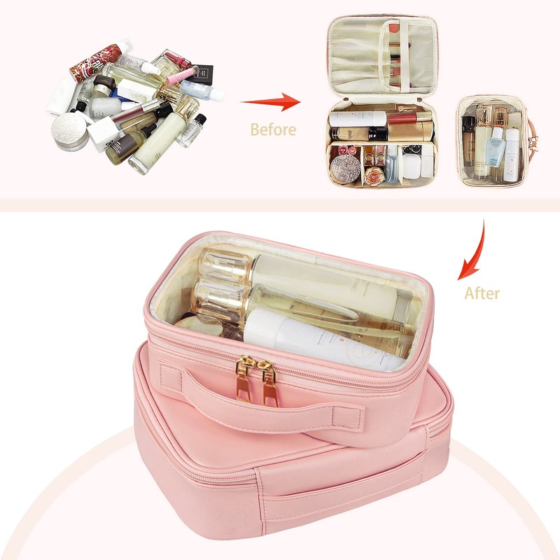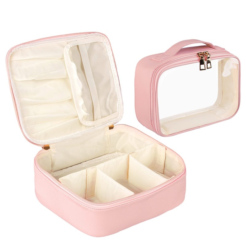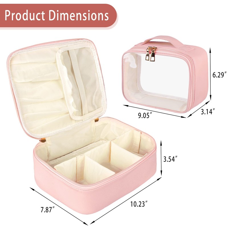 - [Thoughtful Design Features]: The large opening allows for easy access to your items, while the comfortable handle ensures effortless portability. Inside, the makeup brush partition with elastic bands keeps brushes securely in place. The removable compartments provide flexible storage, and the clear bag's transparent design helps you quickly locate your items.