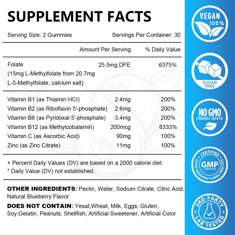 - 【Work Better With B-Vitamin Complex】 Our L methylfolate supplement gummies are combined with methylated multivitamins B1, B2, B6, B12, C and zinc, laying a foundation for the efficient operation of methylfolic acid. This collaboration is not only limited to increasing folic acid levels, but also has significant effects on brain health, cognitive function, and mood support