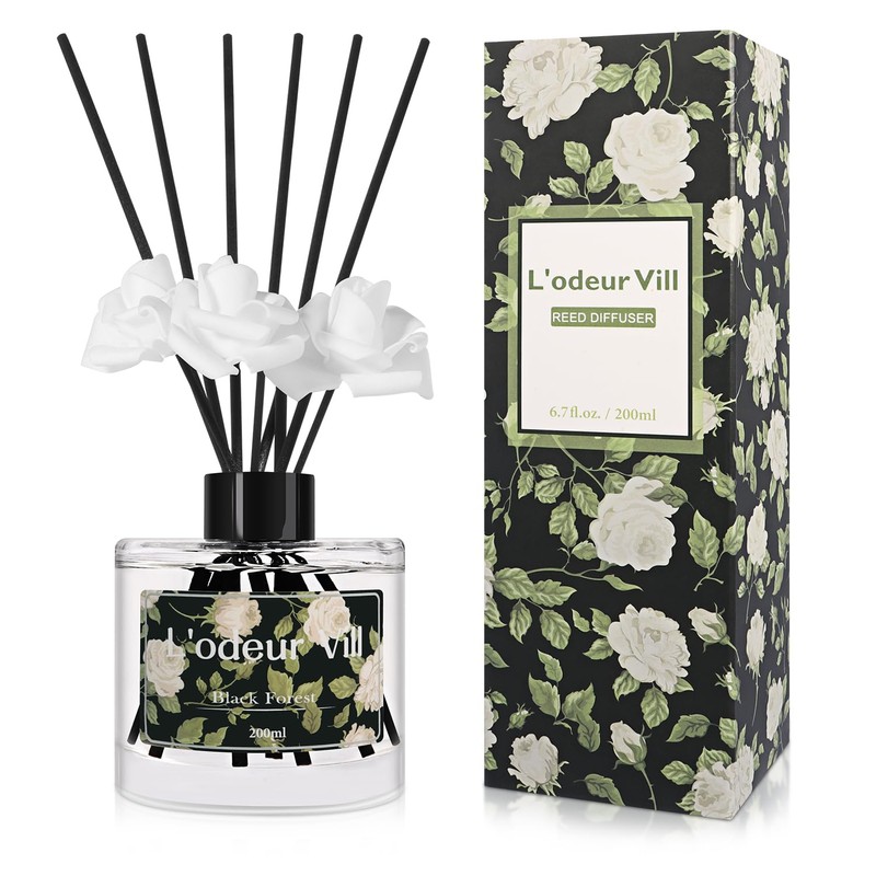 L'odeur Vill Reed Diffuser Set, 6.7 oz Black Forest Scented Diffuser with 6 Sticks, Reed Diffuser with 3 Artificial Rose Home Fragrance for Bathroom Shelf Decor