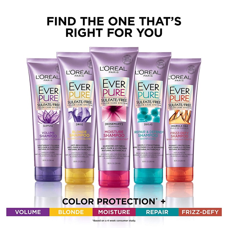 - L'Oreal Paris EverPure Frizz-Defy Shampoo for humidity and frizz control deeply conditions frizz-prone hair