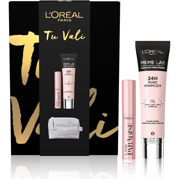 Christmas kit consisting of Prime Lab Advanced Derm Primer 24H Pore Minimizer 30 ml pore minimizing primer and Lash Paradise volumizing black mascara in travel size version. -Long-lasting make-up with instantly minimized pores and volumized, extra-black eyelashes, mattified, smooth and uniform skin and intense eyes, flawless looks throughout the day. -Primer: spread all over the face with your fingertips and apply alone or under make-up, Mascara: apply from the root to the tip of the eyelashes, spreading the product several times. -Primer: formula with 1% LHA and salicylic acid with a creamy pink texture, Mascara: creamy and delicate formula with castor oil with lengthening properties, ultra-soft and rounded brush. -Contents: 1x L'Oréal Paris, Gift Pouch with Pore Minimizing Primer and Volumizing Mini-Mascara, For Long-Lasting Make-Up, With Exclusive Duvet Beauty Case