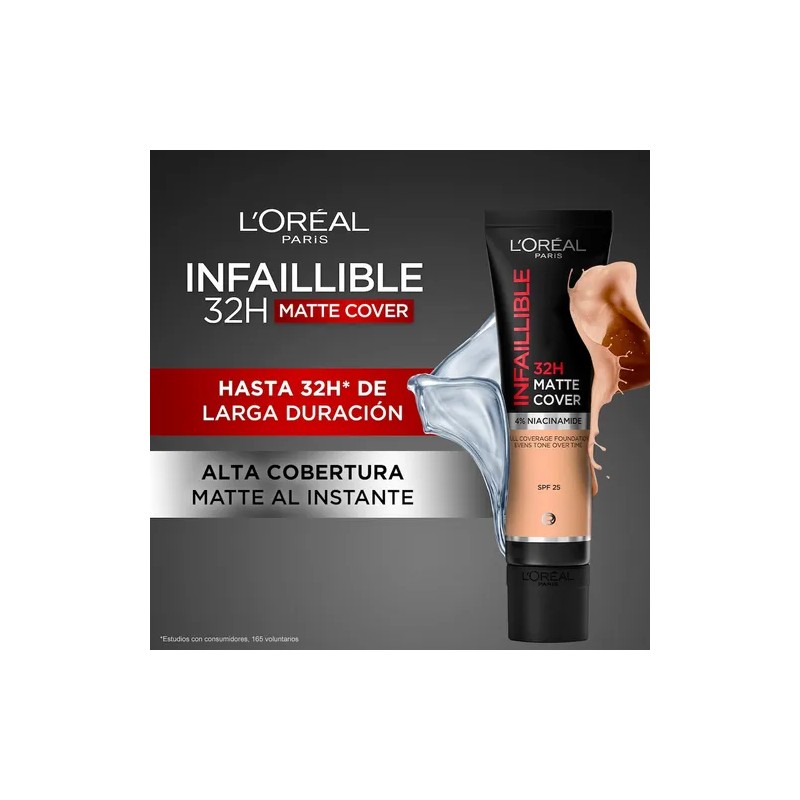 Disfruta de una larga duración de 32 horas de maquillaje perfecto y una alta cobertura con acabado mate que controla el brillo durante todo el día. Además, es a prueba de agua y cuenta con Factor de Protección Solar (FPS) 25, brindando protección contra los rayos UV. Es apta para piel mixta a grasa, no comedogénica, libre de gluten y parabenos, y libre de crueldad animal. ¡Luce una piel impecable, mate y visiblemente mejorada con L'Oréal Paris Infaillible Matte Cover! 💖☀️