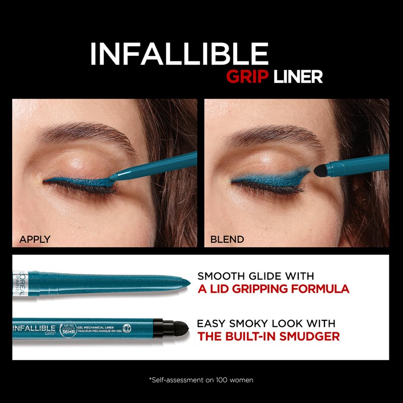 Up to 36HR wear. Easy Application. Waterproof, smudge-resistant. Define & line your eyes with saturated color that lasts. L'Oreal Paris's Infallible Grip gel eyeliner glides effortlessly across lids to deliver a smudge-resistant, smooth line that lasts up to 36 hours. With six shades to choose from you can find a color with hyper-pigmented intensity for any classic or bold look.