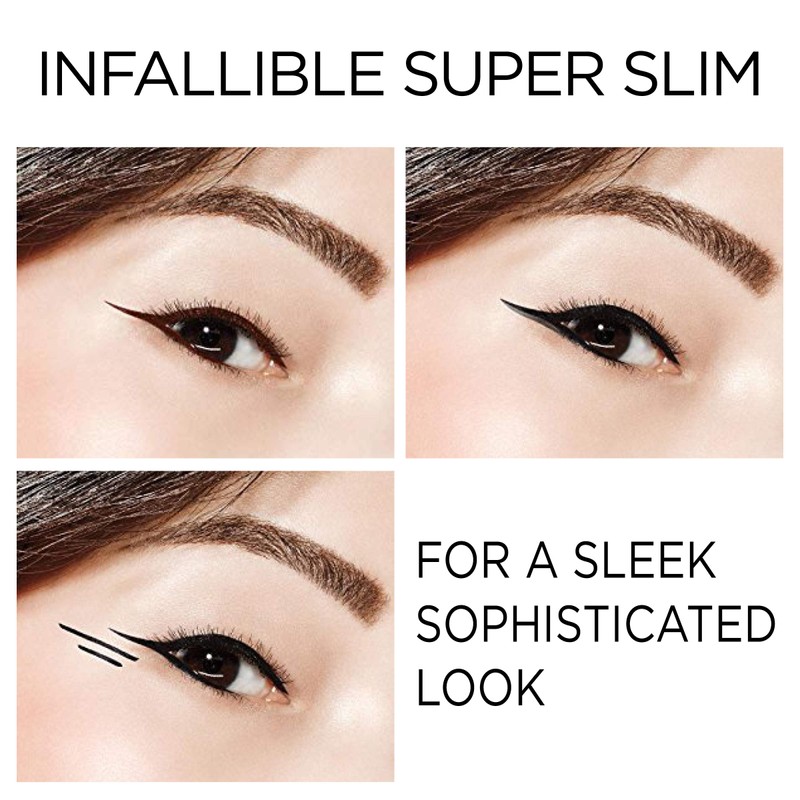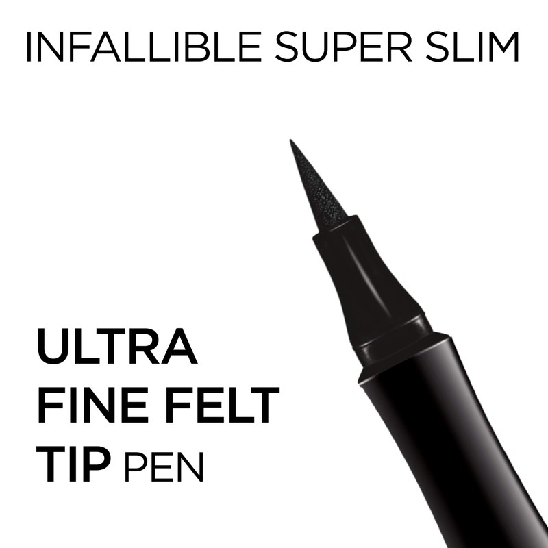 Create sleek and sophisticated eye designs. The 0.4mm ultra-fine felt tip of Infallible The Super Slim gives you total control, delivering the perfect amount of liner. The intense quick dry up to 12HR formula glides on smoothly with continuous and even flow. Skip-proof, drag-proof and smudge-proof.