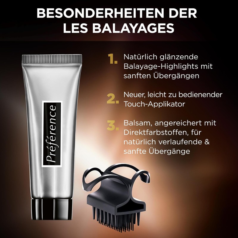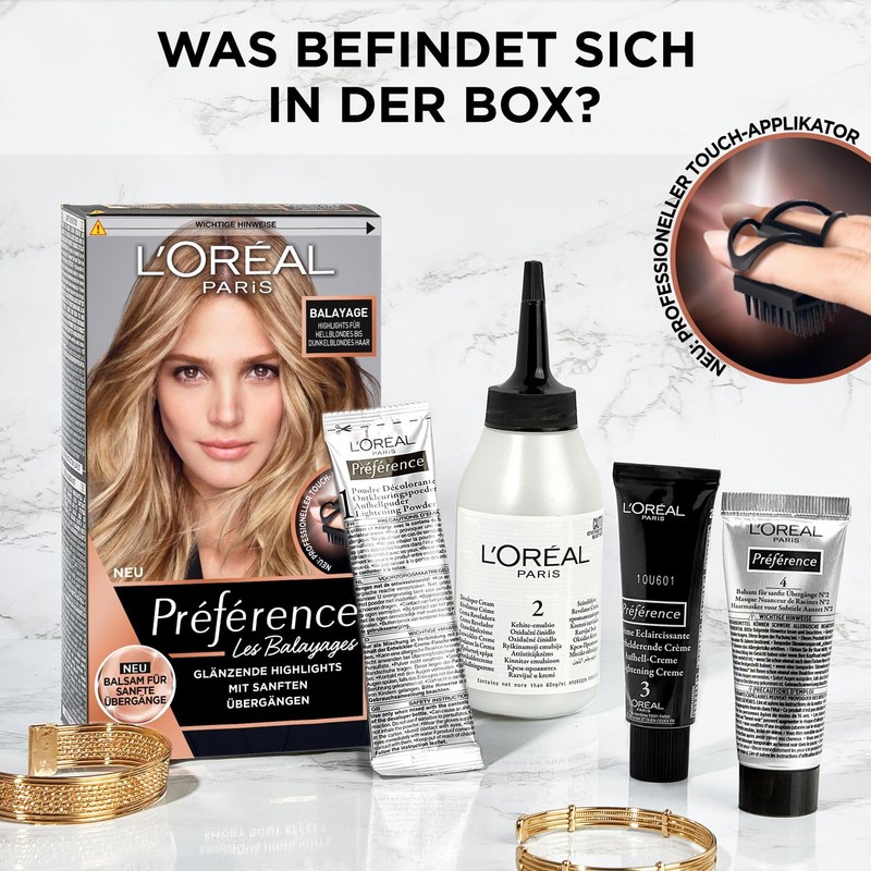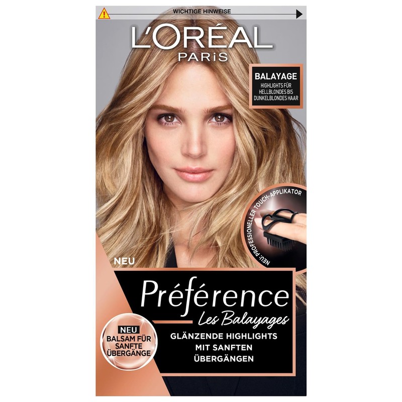 - Lieferumfang: 1x L'Oréal Paris Préférence Balayage Dauerhafte Haarfarbe, Farbe: Hellblondes bis dunkelblondes Haar, Inhalt: Experten-Set mit Farbgel und Experten-Bürste