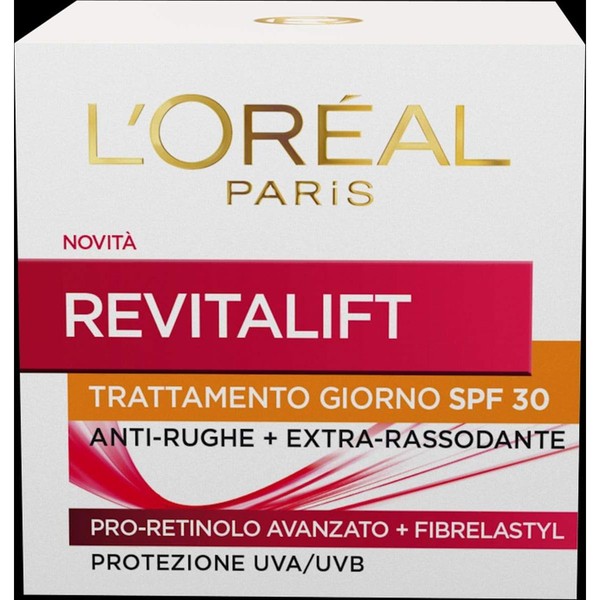 Anti-aging moisturizing cream for toned, protected and hydrated skin, Prevention against the appearance of blemishes thanks to anti-UVA/UVB protection - Results: Immediately protected, more toned and hydrated skin, Firmer skin with reduced wrinkles and a more even complexion 4 weeks - Application in the morning on well-cleansed face and neck with circular movements for better absorption - Formula composed of a powerful active ingredient (Advanced Pro-Retinol) to relax the surface of the skin and a firming complex (Fibrelastyl) to strengthen the skin tone - Contents: 2x L'Oréal Paris Revitalift SPF 30 day treatments, 50 ml