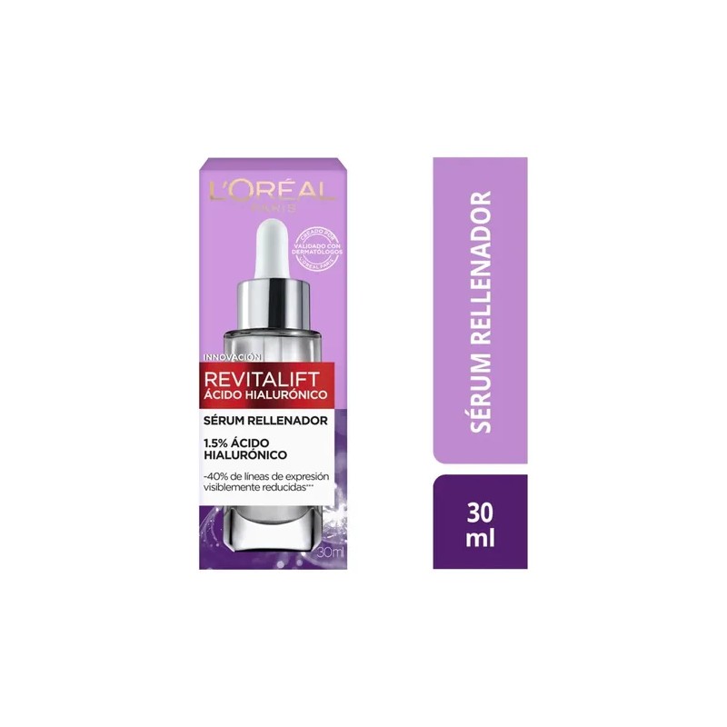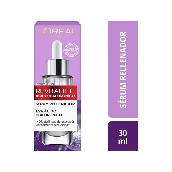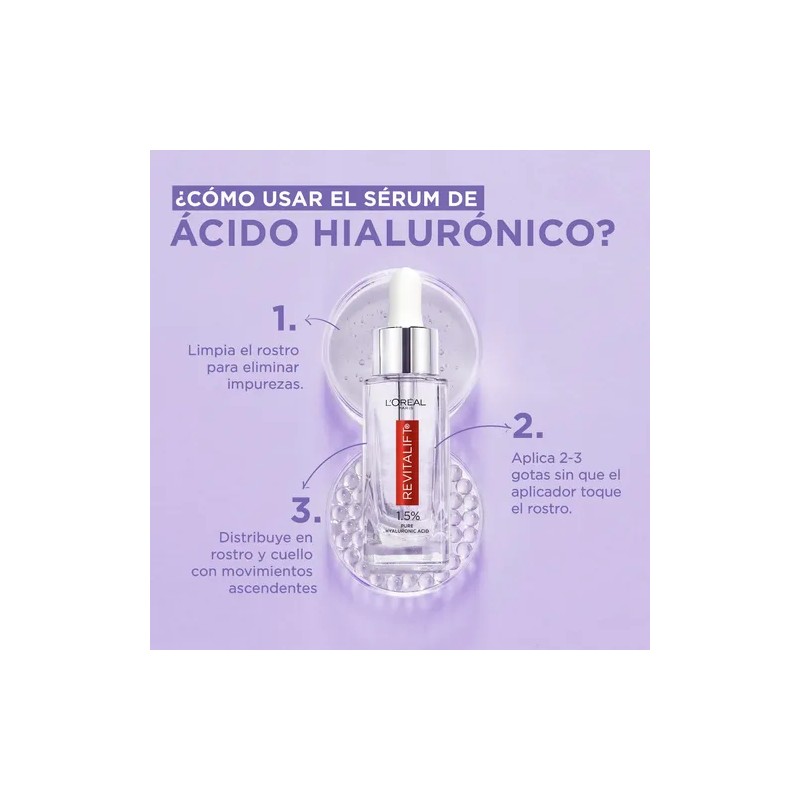 Suero L'Oréal Paris Revitalift ácido hialurónico con alta concentración de ácido hialurónico puro, su fórmula de peso ligero se absorbe rápidamente sin sensación grasosa o residuos