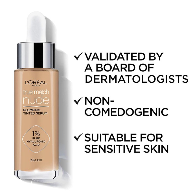 - Contents: 1x L'Oréal Paris True Match Nude Plumping Tinted Serum with 1% Hyaluronic Acid, 30 ml, Shade: 4-5 Medium