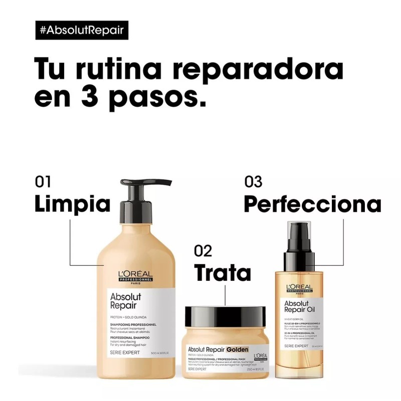 Los ingredientes principales son Quínoa Dorada y Proteína de Trigo. Absolut Repair Gold reduce el daño en un 77%, dejándolo 7 veces más brillante con un tacto ligero, si se utiliza la rutina completa.
