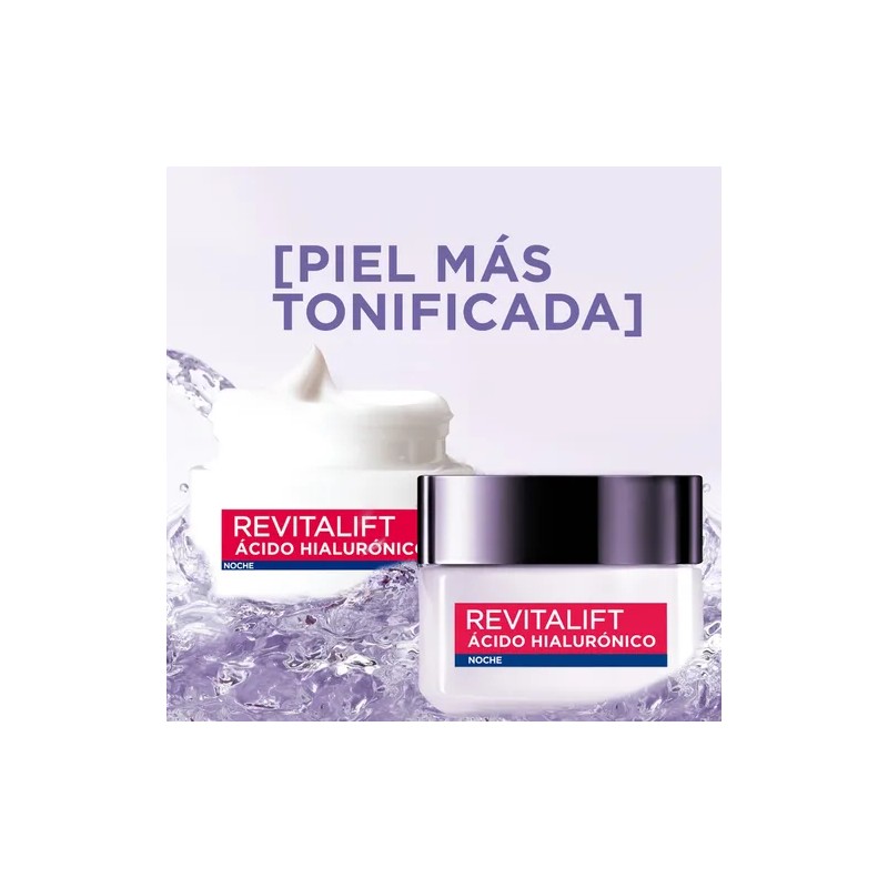Crema Antiarrugas Noche Revitalift Ácido Hialurónico 50 Ml es una crema de noche con ácido hialurónico que proporciona una hidratación intensa, rellenando las líneas de expresión desde el interior. El ácido hialurónico, un componente natural de la piel, disminuye con la edad, lo que puede llevar a la aparición de arrugas.