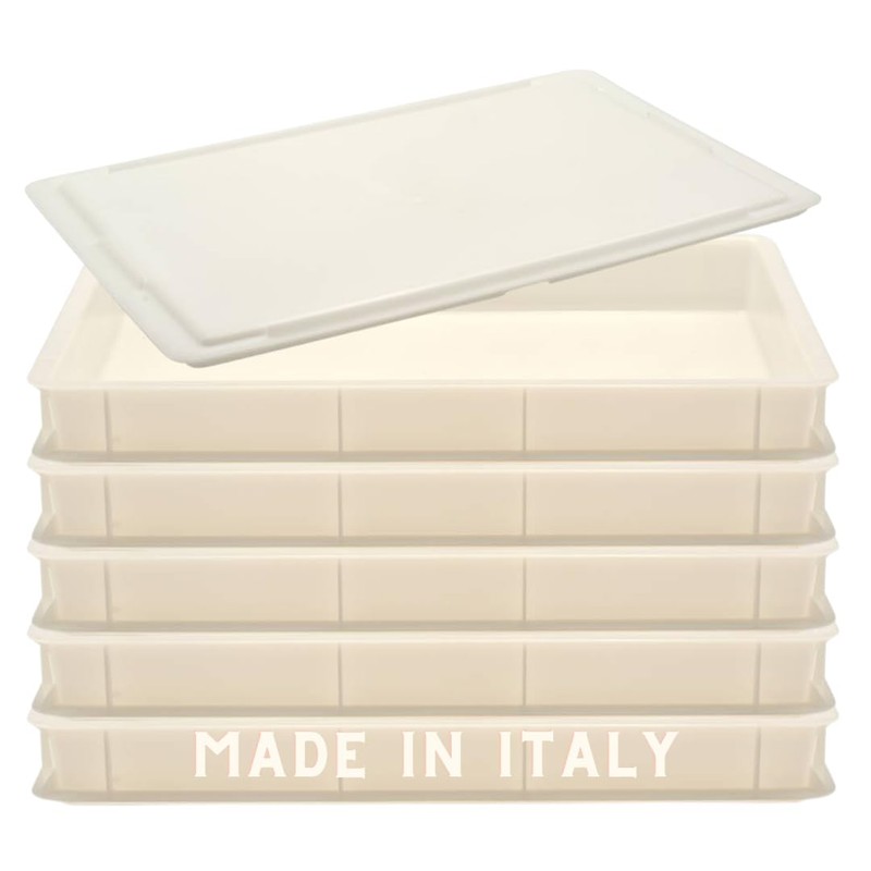 L'Oro Del Sud Commercial Dough Proofing Box Tray with Lid, White, 5 Pack, 23.6" x 15.74" x 2.75", Size Stackable Pizza Container, Bin Resistance to impact, temperature changes, Made in Italy