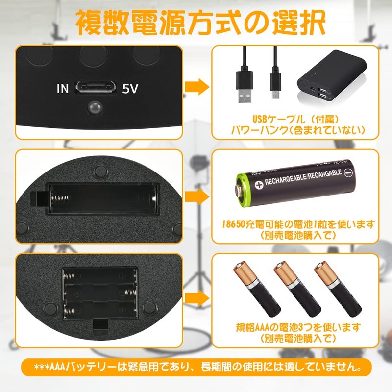 - Use USB cable or 3 AAA batteries or 1 18650 rechargeable battery (battery not included)
