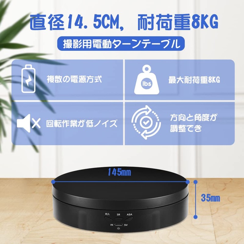 L'QECTED Turntable, Electric Rotary Stand, 360° Rotary Stand, Electric Turntable, Load Capacity 17.7 lbs (8 kg), Adjustable Direction, Angle, Stability, Low Noise, Diameter 5.7 inches (14.5 cm), For Figure Shooting (Black, 5.7 inches (14.5 cm)