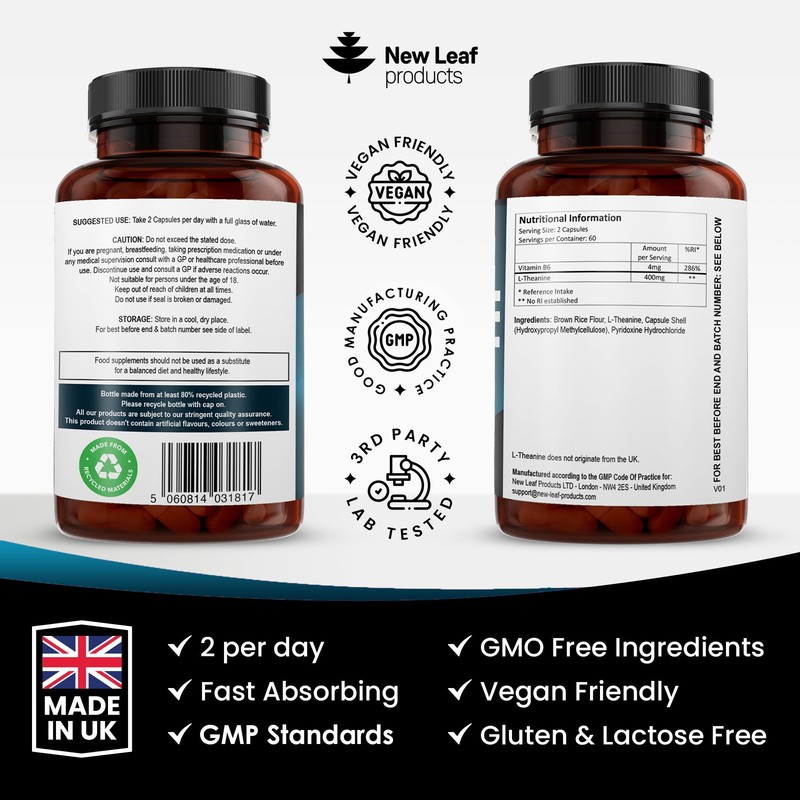 - INTRODUCTION TO NEW LEAF'S L-THEANINE CAPSULES - Our L-Theanine Capsules are specially formulated to support a balanced lifestyle, offering a two-month supply with 120 vegan capsules per bottle. Each serving delivers a potent dose of 400mg L-Theanine, an amino acid primarily found in green & black tea leaves. L-Theanine has been carefully extracted to preserve its purity and potency, making these capsules a simple, effective way to incorporate this beneficial amino acid into your daily regimen.