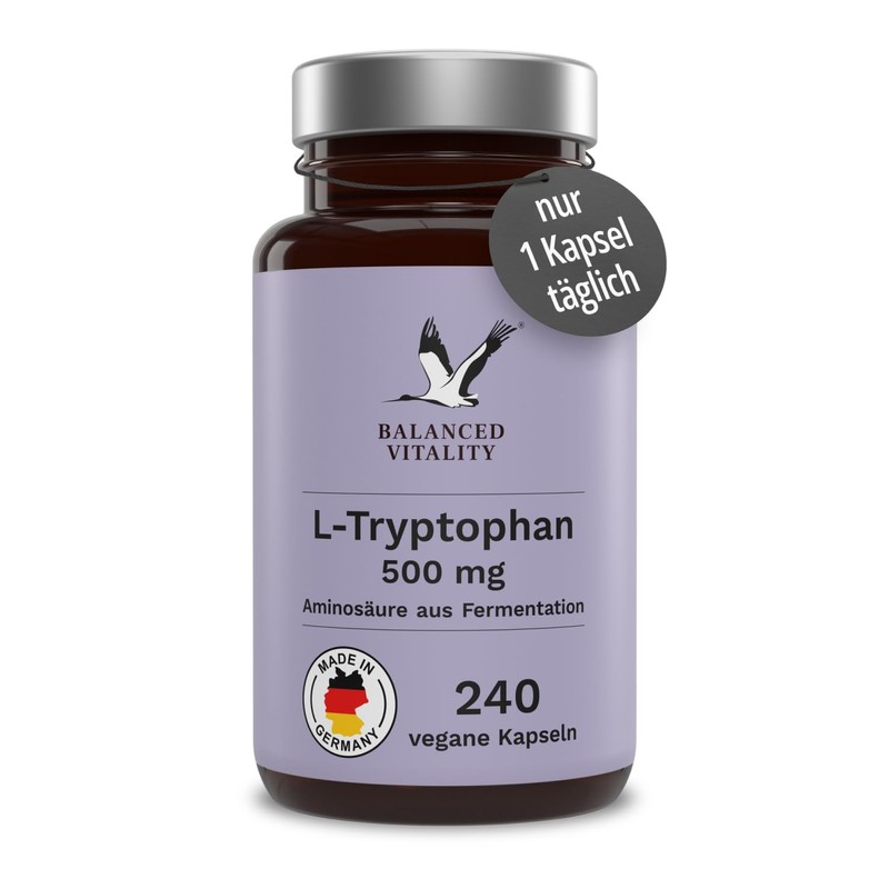 L-Tryptophan High Dose - 500 mg Tryptophan per Capsule - 240 Vegan Capsules for 8 Months - From Vegetable Fermentation - Laboratory Tested - Made in Germany Balanced Vitality