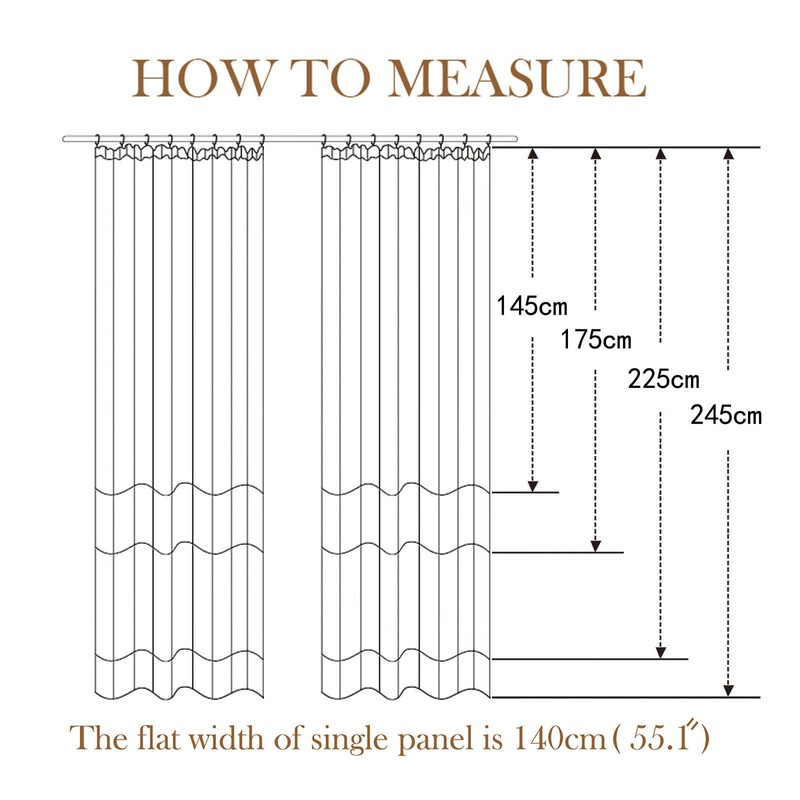 - Sold in pairs (pack of 2). Each curtain panel has a fabric width of 55 inches / 140 cm and a height (from the point where the eyelet touches the curtain pole to the bottom of the curtain) of 57, 68.8, 88.5, 96.4 inches ( 145, 175, 225 and 245 cm ) and is suitable for living room, bedroom, kids room, dining room, kitchen, bay windows, etc. and can also be used as a room decoration