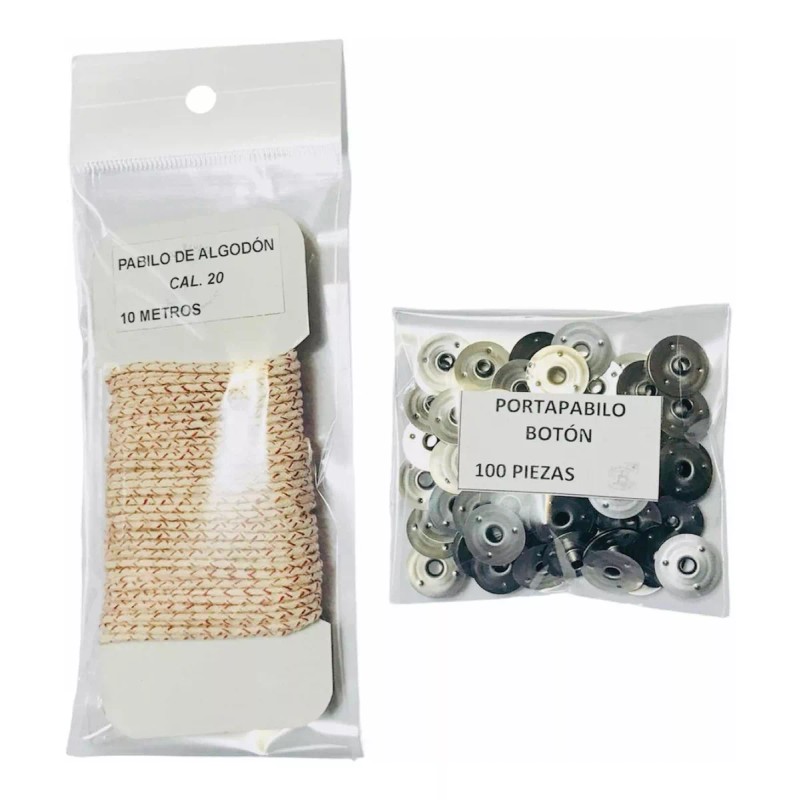 Este pabilo es de Calibre 20 con alma de algodón contiene 10 metros y 100 portapabilos de botón.