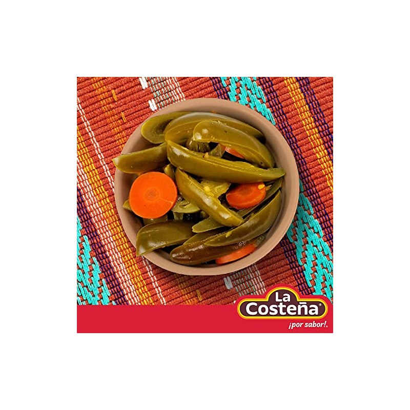 - Green jalapeño peppers packed in vinegar with onions and carrots for extra flavor and color