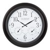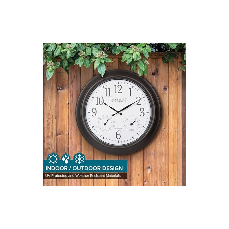 Designed in La Crosse, WI, this 18-inch Atomic Wall Clock features a distinctive soft linen texture background, premium black metal hands, and easy-to-use controls, all wrapped in a stylish frame with a dark bronze metallic finish. Its durable, weather-resistant construction allows for placement indoors or outdoors for comfortable viewing of your time, temperature, and humidity values. With accurate atomic time reception and an impressive 5-year battery life, this 18-inch Atomic Wall Clock will surely be an attractive yet practical addition to your indoor or outdoor space.