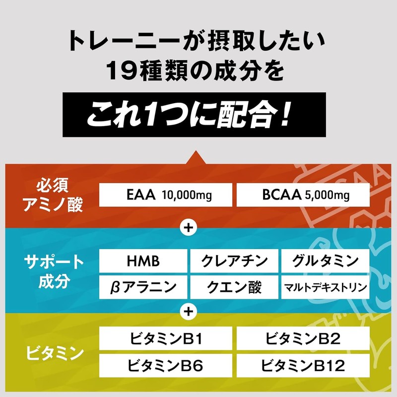 - đăIndustry-leading blendă {EAA: 10,000mg / BCAA: 5,000mg} Leucine 2500mg, Valine 1250mg, Isoleucine 1250mg, Lysine 2020mg, Threonine 1445mg, Phenylalanine 955mg, Methionine 295mg, Histidine 240mg, Tryptophan 45mg