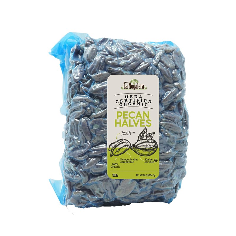 La Nogalera Organic Pecans - USDA Certified Organic Halves in 5 lbs vacuum sealed bag. Pecan nut halves, No Shell, Non-GMO, No Preservatives, Unpasteurized, Kosher and Halal and Ketogenic friendly