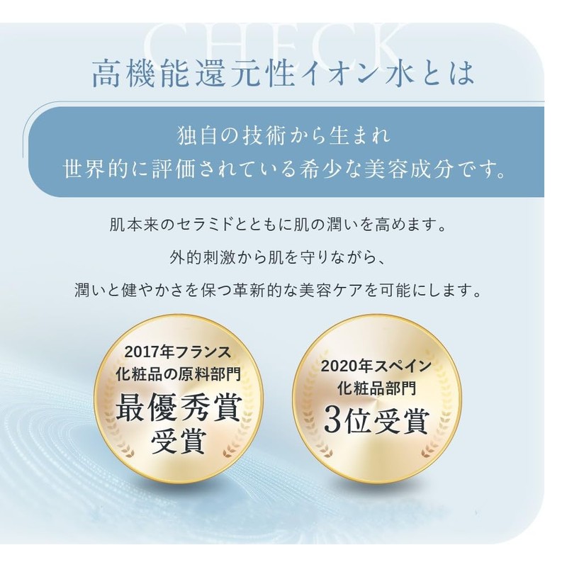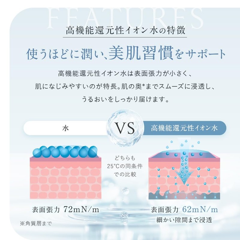 This moisturizing serum uses high performance reduced ionic water. The surface tension is less than water, so it penetrates quickly to the stratum layers of your skin. Free of preservatives (paraben, phenoxyethanol), plant-based active ingredients, hypoallergenic formula for sensitive skin.