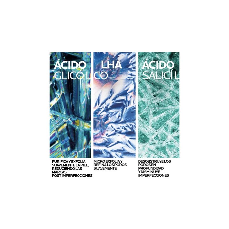 Acción exfoliante y calmante: Con 3 ácidos queratolíticos (Salicílico 1.5%, Glicólico 3.5% y LHA 0.45%) para reducir imperfecciones y marcas, y Niacinamida + Agua Termal para calmar y evitar irritación.