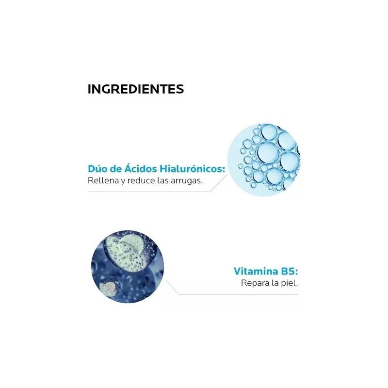 - Fórmula única con dos tipos de ácidos hialurónicos puros y vitamina B5, que proporcionan hidratación y ayudan a rellenar la piel.
