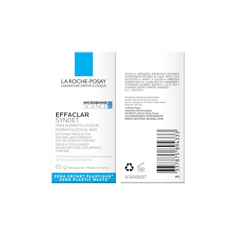 • Effaclar Syndet Dermatological Bar provides anti-shine, anti-dryness and purifies oily, acne-prone and sensitive skin