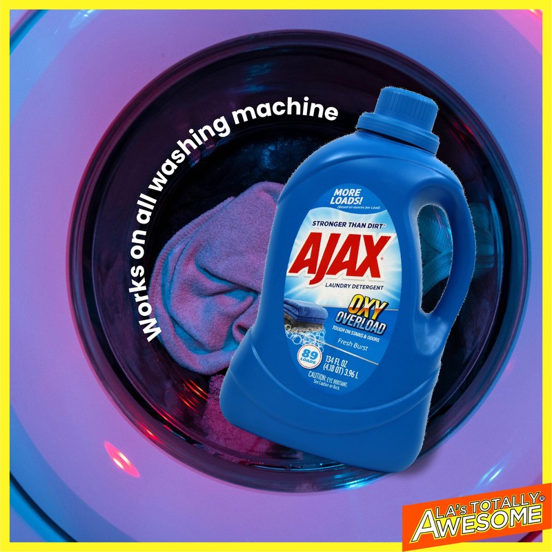 • TOTALLY AWESOME STAIN & ODOR FIGHTING POWER  C Ajax Laundry Detergent Oxy Overload is stronger than dirt, combining oxygen-based technology with totally awesome cleaning power that tackles even the toughest stains and odors, just like LA's Totally Awesome Cleaner does for your home!