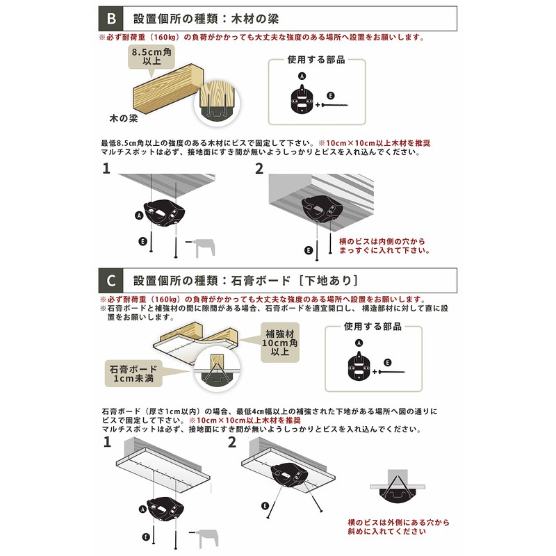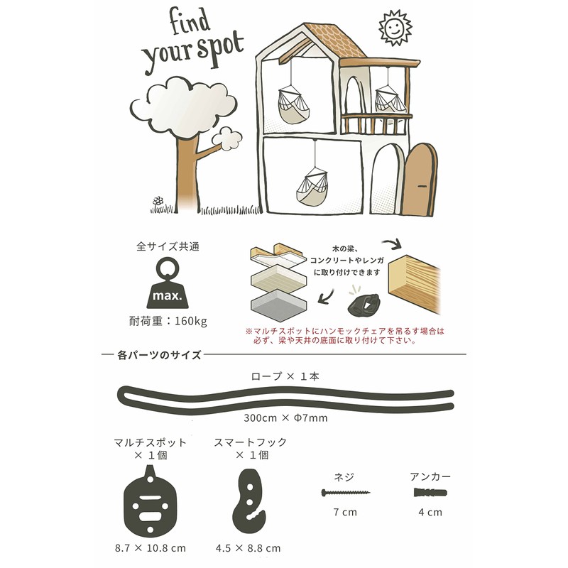 - Contents details: Multi-spot (4 holes) x 1, Smart hook (adjuster) x 1, Rope x 1, Screw x 4, Anchors x 4 (please use the included anchor when securing to concrete)
