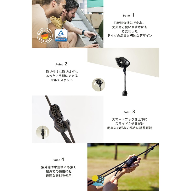 - [About this item] This is a mounting tool for fixing hammock chairs on ceilings and beams. The foam (multi-spot) fastens in four locations for ideal load distribution. The smart hook is extremely easy to install and remove the hammock chair. You can freely adjust the length of the rope by sliding the smart hook through the rope. Therefore, you can easily adjust the height to suit the rider. (Kids can ride with confidence if they are lowered according to their height) This set is not only convenient but also weatherproof treated to resist UV rays, making it perfect for outdoor use in the garden or balcony. Parts are 100% made in Germany and are rigorously tested by a safety testing agency TUV-Rheinland