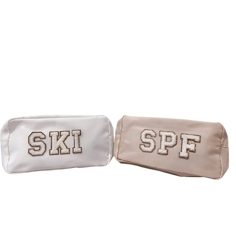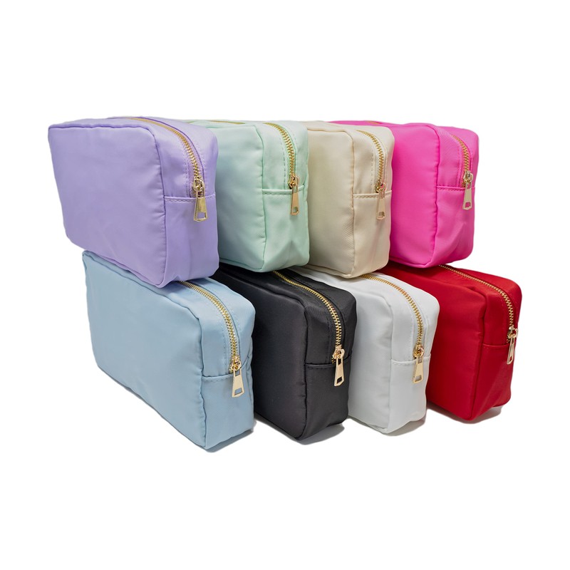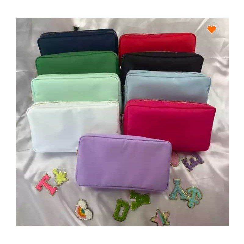 Our travel pouches can be used as preppy customizable patch makeup bags, skincare bags, preppy skin care organizer, varsity letter makeup bag, hair bags for hair stuff and much more. Our preppy pouchs are made of top-quality water-resistant material. Our plain cosmetic pouch is made with nylon and polyester material that will not only last long and will also enhance your customized pouch experience. Our pouch bags are stylish and are your go to bag!