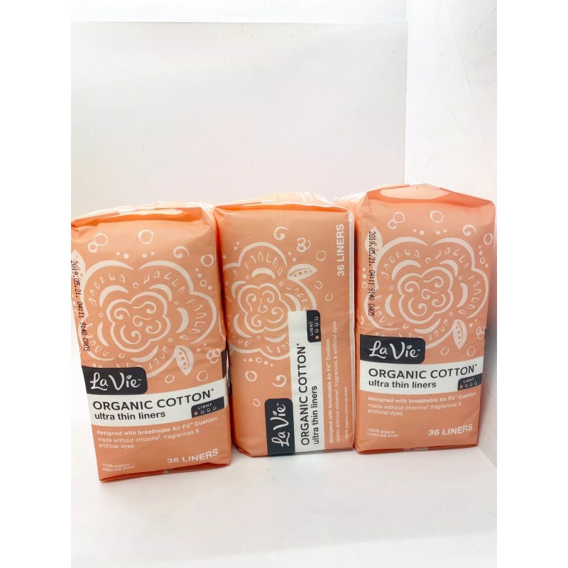 The time is now to stop making compromises when it comes to your period protection. What you put in your body and on your body matters which is why La Vie Organic Cotton Top sheet* Panty Liners and Pads for Women are made WITH a top sheet of fibers that are 100% organically grown cotton and WITHOUT fragrances and artificial dyes. La Vie is the only organic cotton top sheet* sanitary napkin made with a breathable AirFit cushion allowing the pad or liner to fit close to your body for fast absorption helping to keep you dry, comfortable and protected from leaks. La Vie period pads and panty liners are made from carefully sourced cotton and an OCS certified top sheet made with organic cotton ensuring only fibers that are 100% organically grown cotton come in contact with your skin. Choose from La Vie feminine pads and pantiliners to find the protection best for you ultra thin panty liners, ultra thin regular pads with wings, heavy absorbency long maxi pads with wings and overnight maxi pads with wings. These women's organic cotton top sheet* menstrual pads and liners are individually wrapped and unscented. Packaging delivered to you may vary from the images shown. This package contains 36 Organic Cotton Top Sheet* Ultra Thin Panty Liners. *Top sheet fibers 100% organically grown cotton